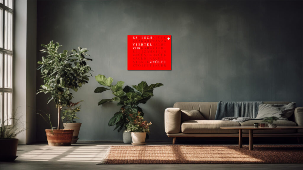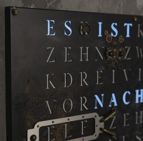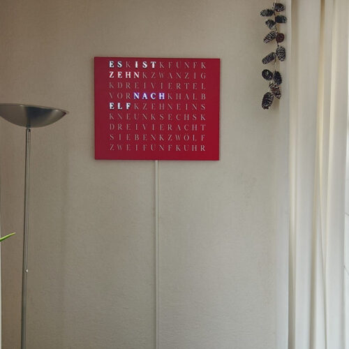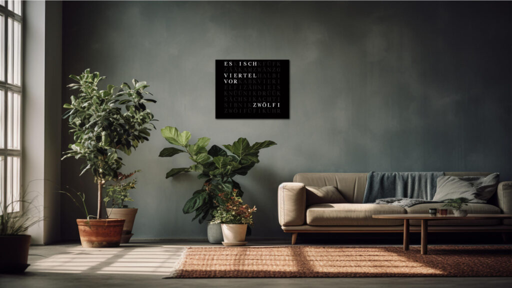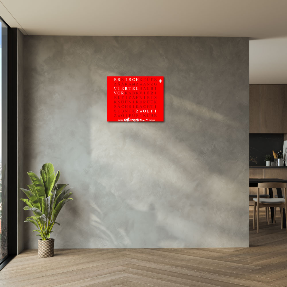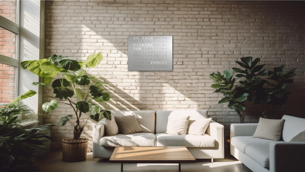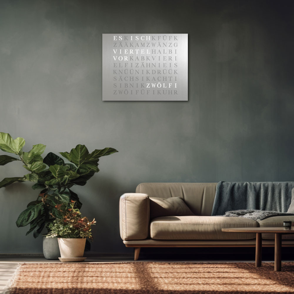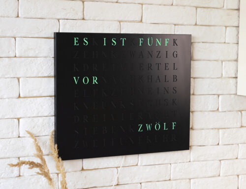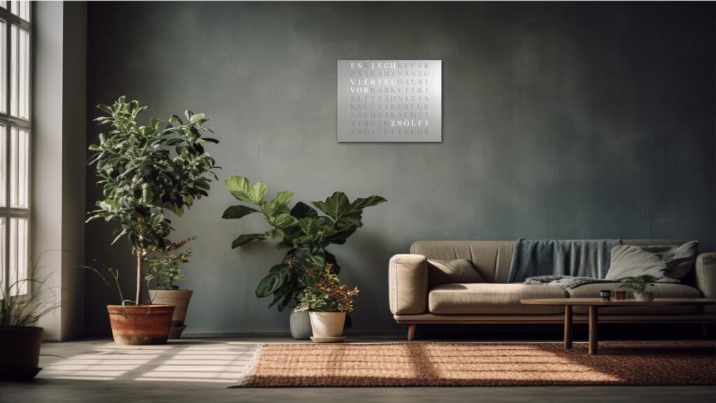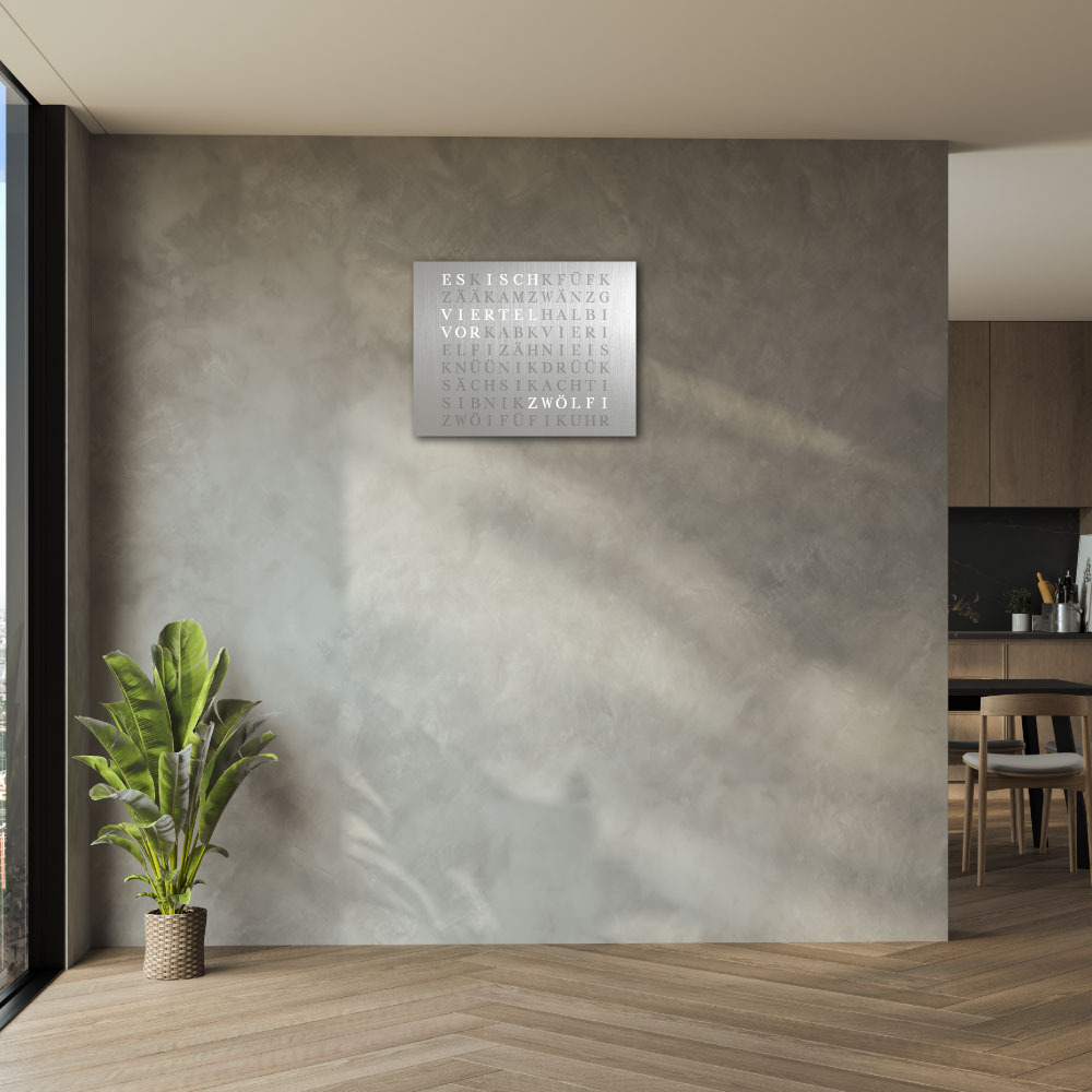 Time in its most beautiful form. The WordClock Jupiter combines clear geometry, precise material processing and harmonious lighting. As a rectangular wall clock (50 × 40 cm), it blends seamlessly into modern rooms and emphasises a conscious design claim. For a piece of technology that fulfils Swiss design standards