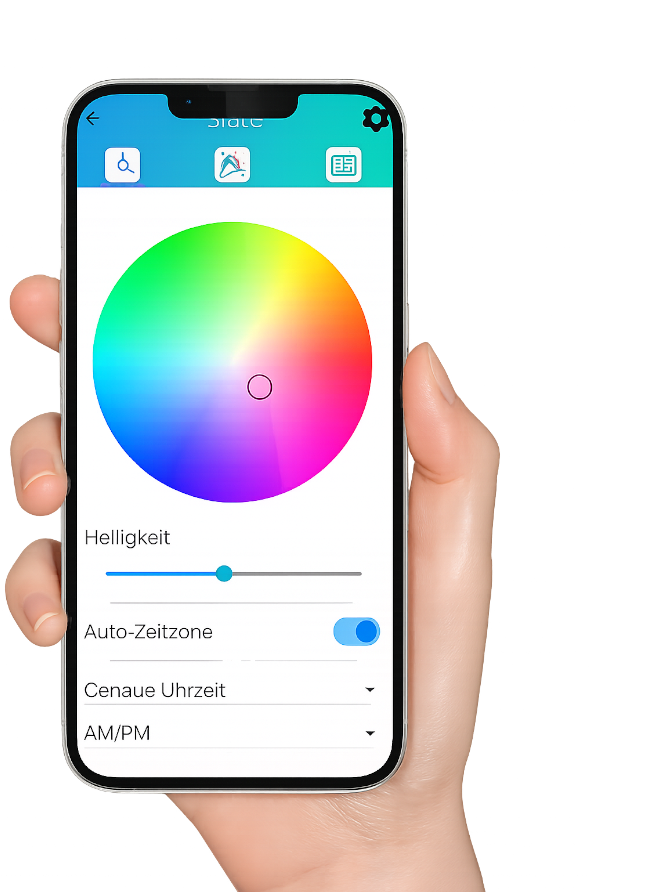 Wähle die Farbe deiner LED-Anzeige aus über 16 Millionen Farbtönen – einfach mit dem Farbrad auf die gewünschte Farbe stellen und die Zeit in deiner Lieblingsfarbe erstrahlen lassen.Choose the color of your LED display from over 16 million shades – simply set the color wheel to your desired color and let the time shine in your favorite hue.